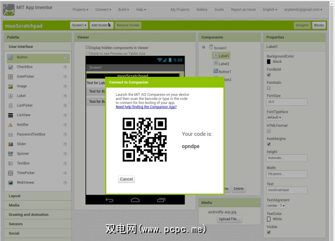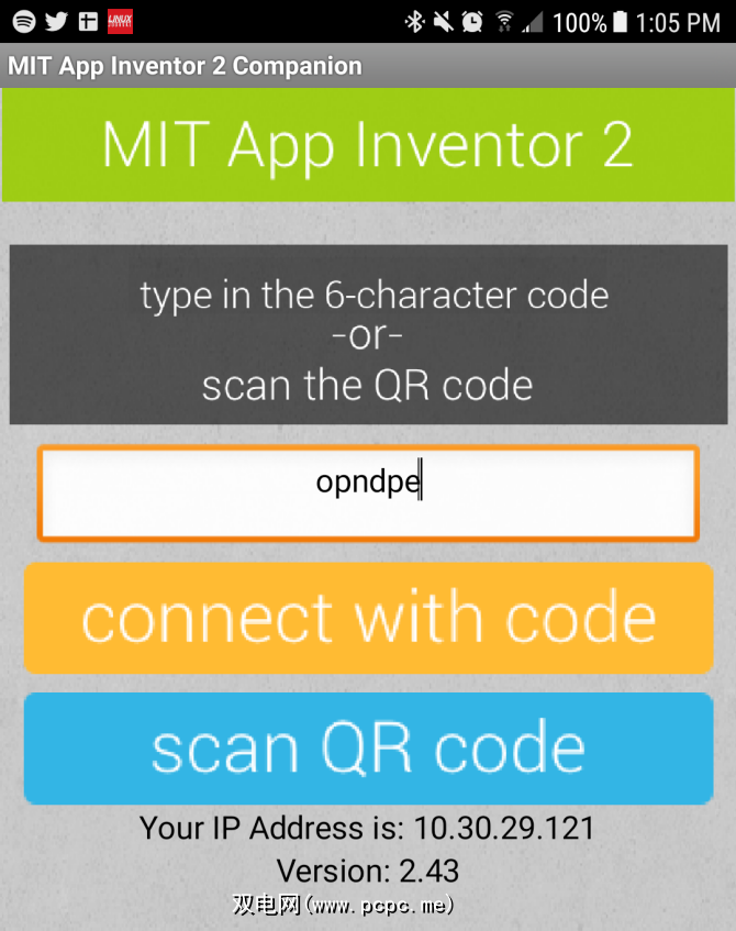 Don’t build a big list of things into your app in one go, because if something breaks, it takes a long time to figure out why. If you’re looking to test on a real phone, you can start up your AI2 Companion app and connect to App Inventor with either the QR code or the six-character code provided.