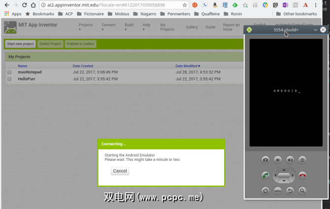 /usr/google/appinventor/commands-for-appinventor/aiStarter &一旦运行,您可以通过单击连接中的仿真器项来测试连接。强大>菜单。如果您看到模拟器旋转起来(如下图所示),那就很好了。