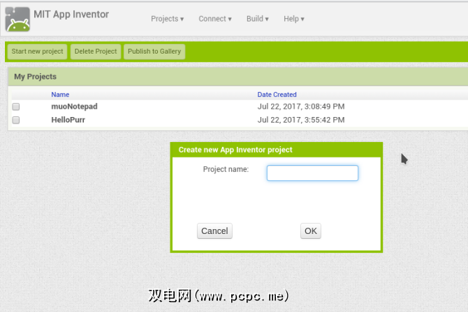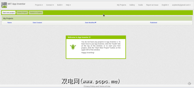 第一步是创建一个新项目。登录到App Inventor,然后单击左侧的开始新项目按钮(也可在 Projects 菜单中找到)。