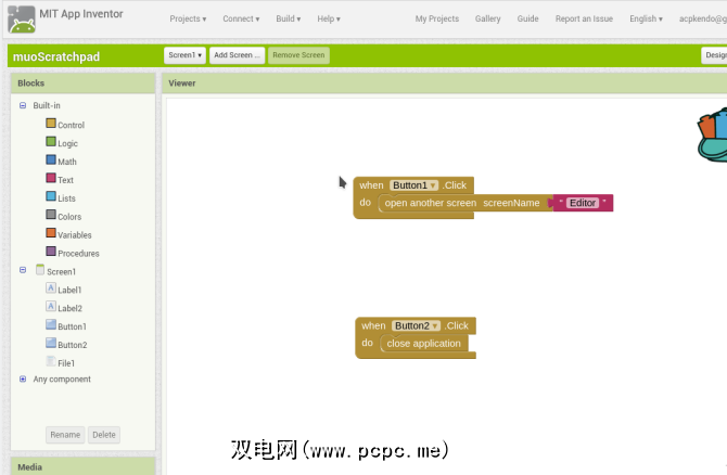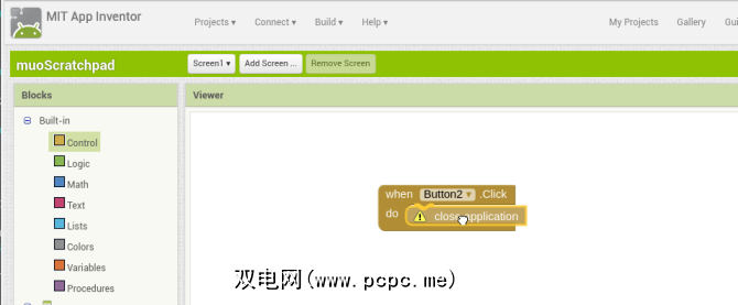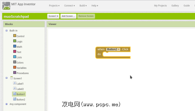 您当然可以阅读App Inventor上的所有指南和教程。但是,它的目的是让您开始单击即可(从字面上看)合适的内容。在我们的初始页面上,我们有两个需要注意的项目(“按钮"),所以让我们看一下我们能想到的。单击其中之一(Button2)将关闭应用程序。由于这是与按钮的交互。我们可以检查按钮块,并找到一个以 Button2.click (或单击Button 1时)开头的块。这正是我们想要的,因此我们将其拖到查看器上。