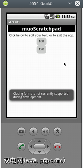 现在,当您单击按钮时,该应用程序将关闭。让我们在模拟器中尝试一下。它向我们显示了一个错误,指出在开发环境中不支持关闭该应用程序,但是看到它意味着它可以正常工作!