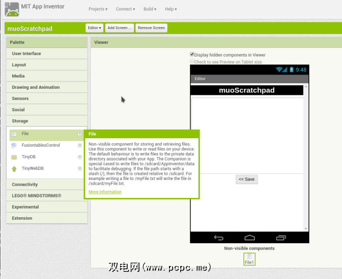 其中,文件是最简单的选项,并且由于我们需要纯文本,因此会很好。将其放在查看器中时,您会发现它没有出现。 文件是一个不可见组件,因为它在后台工作以将内容保存到设备上的文件中。帮助文本可让您了解其工作原理,但是如果希望这些项目可见,只需选中在查看器中显示隐藏的组件复选框。