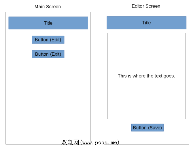 一种将允许用户“立即编辑"或退出,而另一种将进行实际的编辑。第一个屏幕看似无用,但稍后在我们添加功能时可能会派上用场。由于纯文本规则,“编辑"屏幕上捕获的文本将保存在纯文本文件中。以下线框为我们提供了很好的参考(只需花5分钟即可完成):