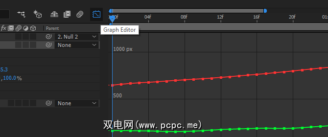 请记住,由文本或形状进行的任何运动跟踪都将通过null对象进行修改,因为它是协调运动的空对象。单击空对象旁边的下拉图标,直到看到位置关键帧。然后,单击时间线上方稍稍标记为图形编辑器的S曲线图标。