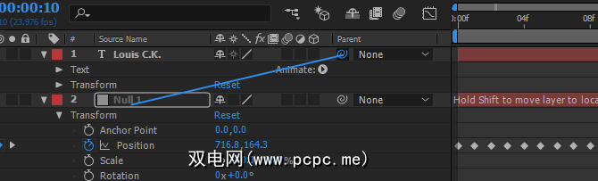 从空对象到文本的运动信息。将文本绑定到空对象之后,播放剪辑。