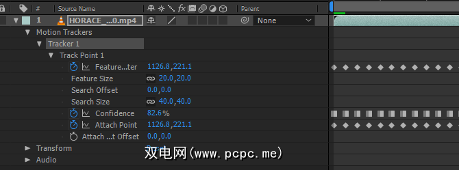 跟踪器完成运动分析后,请确保它已跟踪了平滑的路径。在AE的时间轴部分上,单击源视频旁边的下拉图标,直到显示轨道参数和关键帧。