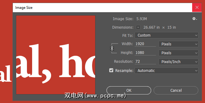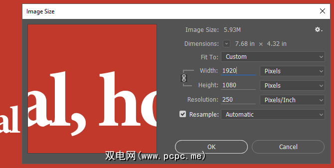 确保您的宽度和高度测量值设置为像素。然后,根据自己的喜好更改分辨率。您会注意到更改分辨率还会增加图像的宽度,高度和尺寸。将宽度和高度更改回原始图像大小。尺寸参数将保持不变,因为这是图像的像素密度修改后的副产品。