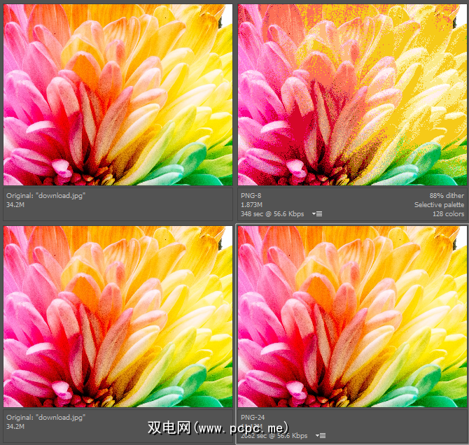 您可能会注意到,文件大小之间也存在相当大的差异。原始大小为34.2 M(兆字节),PNG 8图像为1.87 M,PNG 24为11.13M。这反映了PNG 8和PNG 24图像之间的摇摆质量。