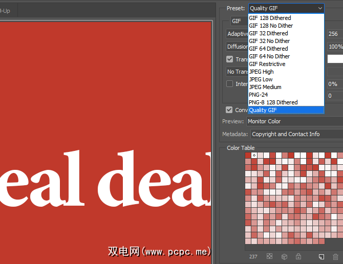 SFW是主要功能Photoshop用户应使用该功能保存图像以供在线使用。请记住,保存高质量图像只会保留现有图像的质量。例如,除非是矢量图像,否则以200×200的图像缩放到1920×1080的分辨率时看起来效果不好。要查看SFW的格式选择,请单击 Preset (预设)旁边的下拉菜单。
