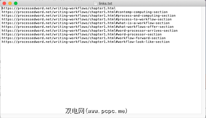 要在实践中演示这些命令,请考虑一个名为《编写工作流程》的网站手册。本手册由目录和指向各章的链接组成。最终目标是要为这些部分创建一个单独的PDF文件。