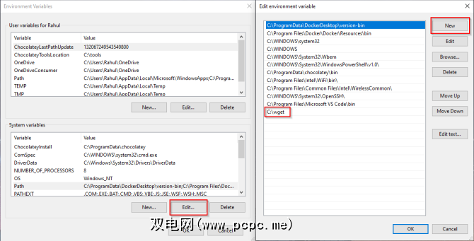 选择系统变量下的路径,然后单击编辑。然后,点击窗口右上角的 New 按钮。键入 C:\ wget ,然后单击确定。