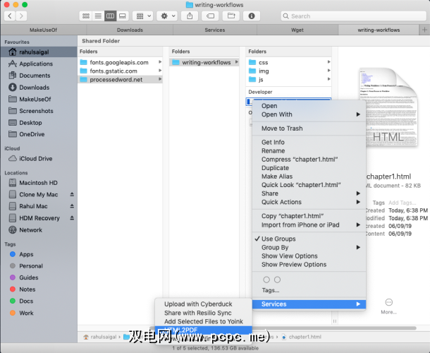 现在,在Finder中选择所有HTML文件。右键单击并选择服务> HTML2PDF 。等待片刻以转换所有文件。