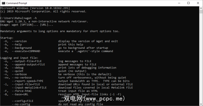 打开命令提示符并键入 wget-h 测试是否一切正常。在 PowerShell 中,键入 wget.exe -h 以加载Wget帮助菜单。