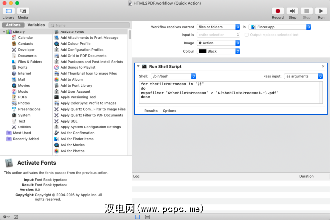在Mac上,您可以创建Automator服务,将一批HTML文件转换为PDF。打开 Automator 并创建一个 Quick Action 文档。设置服务选项以从Finder接收文件或文件夹。接下来,拖动运行Shell脚本,并将传递输入选项设置为作为参数。然后,将此脚本粘贴到正文中