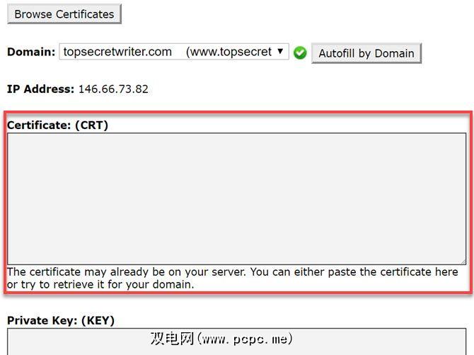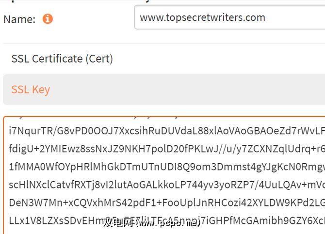 在这里,您会看到可以粘贴SSL证书和私钥的字段。