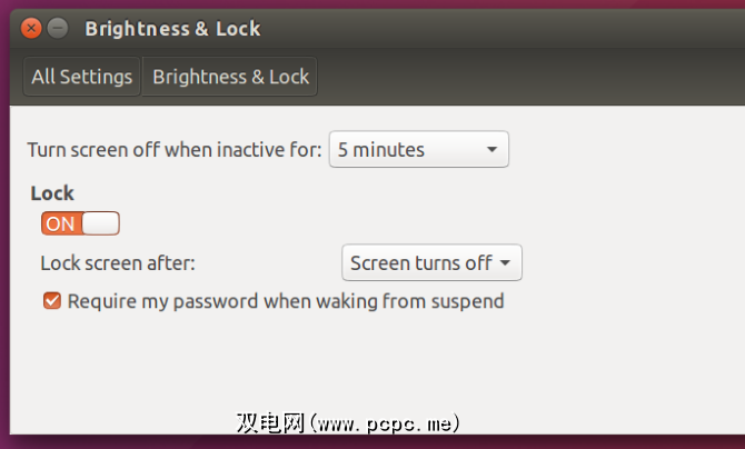 作为后备,您应该确保在激活屏幕保护程序时锁定屏幕。您可以通过在Ubuntu的设置下导航至 Brightness&Lock (亮度和锁定)来找到这些设置。