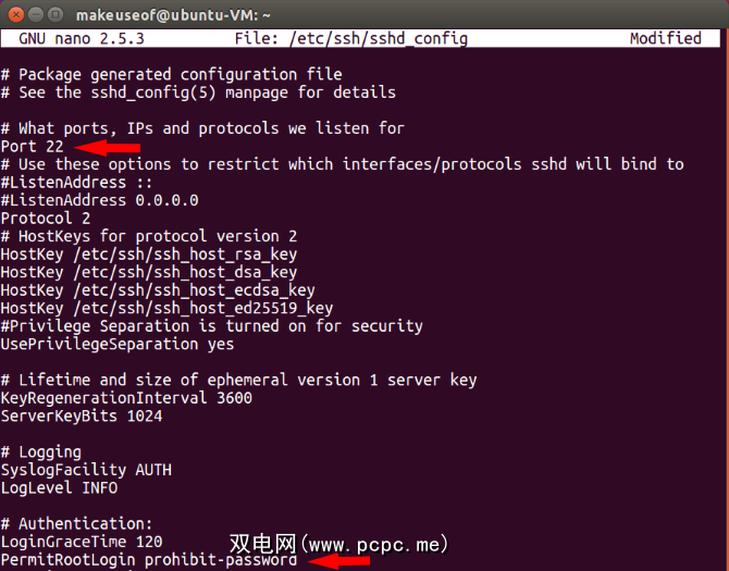 sudo nano /etc/ssh/sshd_config打开文件后,查找显示 Port 和 PermitRootLogin 的行。您应该将端口更改为一个不常用的端口号,并且该端口当前尚未被系统使用。请参阅文章中的下一点,有关如何检查其他程序当前正在使用哪些其他端口。如果您仍想使用SSH密钥对通过 root 登录,可以将 PermitRootLogin 设置为禁止密码。