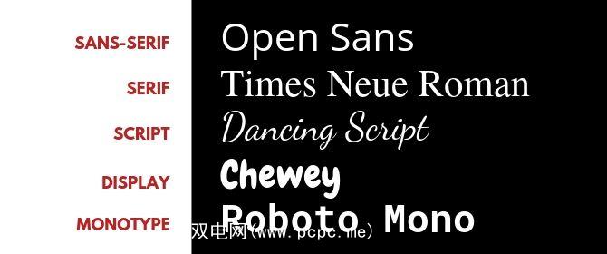 除了sans-serif和serif之外,设计师还提供了三种附加分类用于指代字体。 脚本是指模拟弯曲笔迹或书法的脚本。