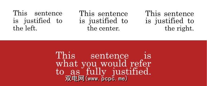 根据最终行将其自身对齐到哪一侧,可以将对齐的对齐方式进一步分为四种类型。如果一段文本完全对齐,则意味着一段文本中的所有行都将对齐到任一侧。通常看起来有些混乱,但是在设计某些材料时可能很有用。