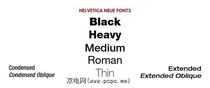 在Helvetica下,字体的重量多种多样,例如黑色,中等和较薄。也有扩展和精简版本。对于每个重量和宽度,都有一个对应的倾斜版本。所有这些关于重量,宽度和斜体的变化都是单独的字体。