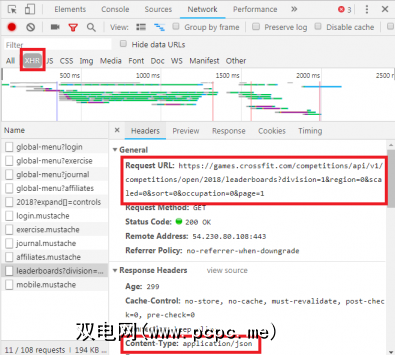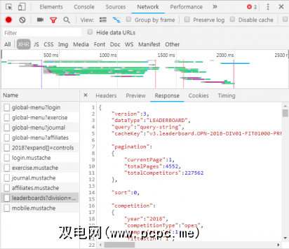 通过如上所述的“网络"标签,您可以查看是否存在这种类型的交换。在调查CrossFit Open排行榜时,将显示使用数据填充表格的请求。