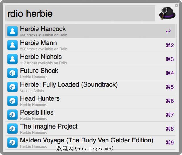 Alfred内置了-用于搜索和导航iTunes的工作流程,但还有用于流媒体音乐服务Rdio的类似工作流程。此工作流使您可以在网站上搜索和播放歌曲,而不必将Rdio网站或专用播放器应用程序置于最前沿。但是,您确实需要成为Rdio订户。