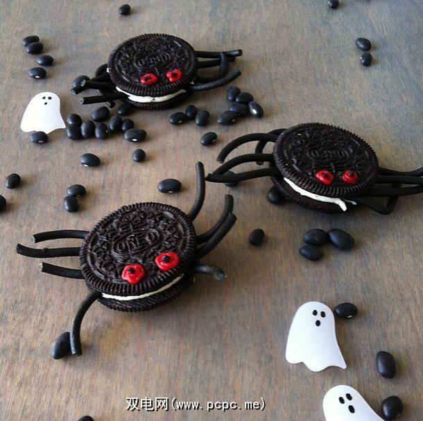 一点点的甘草可以使普通的奥利奥包变成令人毛骨悚然的东西令人毛骨悚然的饼干。折下甘草(最好是黑色的甘草),然后将其粘贴到饼干的奶油中心,使其看起来像腿。用管道为眼睛结冰,就可以了!
