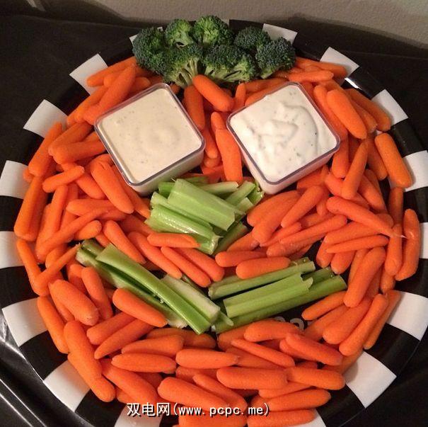 这可能是一个很棒的最后一刻,简单的拼盘,您可以参加聚会。胡萝卜,芹菜,西兰花和蘸酱,使其看起来像南瓜。