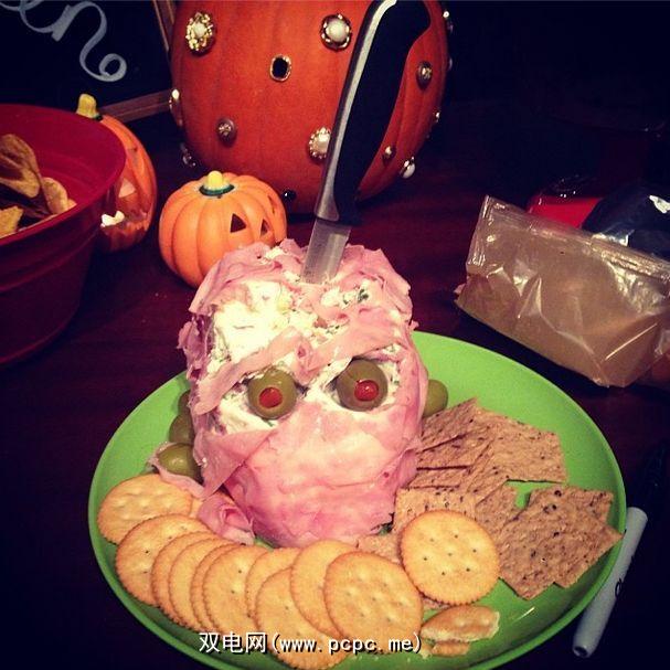 拿一大包奶油芝士或马苏里拉奶酪,然后从上面雕刻一个头骨。它不一定是完美的,因为您将用火腿火腿来覆盖其中的大部分。倒入几只橄榄,露出怪异的眼睛,然后搭配饼干。穿过头骨的刀既有趣又有用,所以去吧!