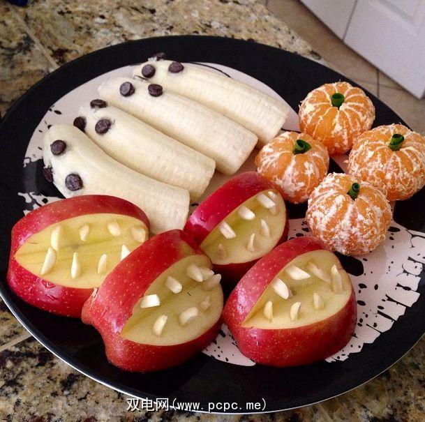 谁说万圣节必须是糖尿病患者恶梦?香蕉鬼只是香蕉,上面贴有巧克力片。对于吸血鬼苹果,您可以使用很多材料制作牙齿,但是白巧克力将是最佳选择。杏仁杏仁也可以很好地工作,并且所需的工作要少得多。至于橙色南瓜,将芹菜叶或菠菜叶卷起并粘在其中。万圣节快乐果味浓郁!