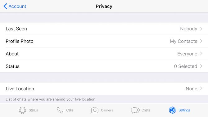 转到设置>帐户>隐私,您可以调整所有您的WhatsApp隐私设置。默认情况下,每个人(不仅是您的联系人)都可以看到您的上次查看时间,状态消息和个人资料图片,它们共享的内容可能太多了。