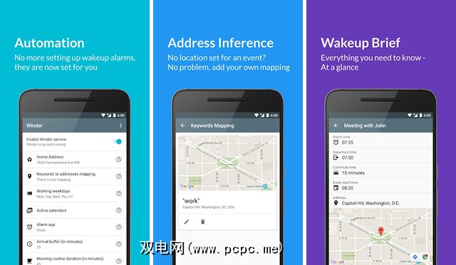 Winder 使它如此,因此您无需手动再次设置您的任何闹钟。无论如何,这就是主意。您可以设置地址,工作日,日历,通勤时间,活动地点等等。基于此,它可以自动为您提供警报。