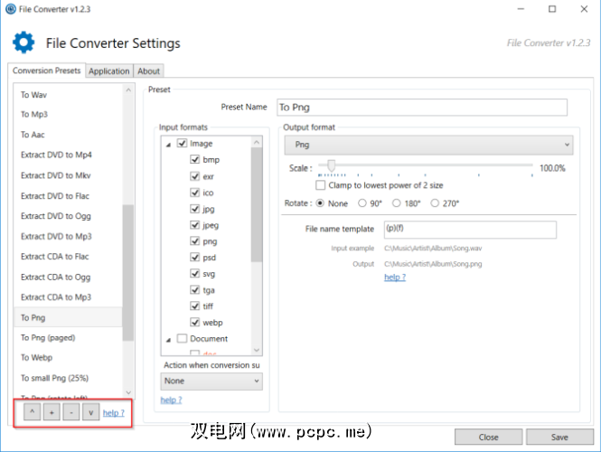要创建简单的预设,请打开文件转换器设置,然后选择要创建的预设。点击加按钮,在左侧面板中创建一个新的预设,并在右侧面板中显示其选项。对于图像,右侧栏将包含缩放,旋转和重命名图像文件的设置。