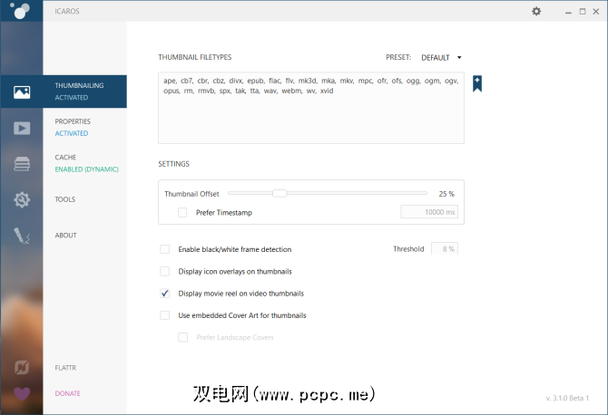 Icaros是一堆Shell扩展程序,可在文件资源管理器中启用并显示任何视频类型的缩略图。当您安装该应用程序时,Icaros将注册FFmpeg支持的常见文件类型以及FLAC,APE和MPC格式。