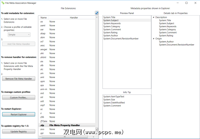 要添加元数据,请选择文件扩展名,然后选择Windows提供的可编辑属性的配置文件。然后,点击添加文件元处理程序。重新启动资源管理器以生效。
