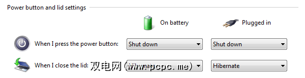 您可以通过单击电源按钮来关闭笔记本电脑或关闭盖子。只需从电源选项中选择相应的行为即可。您甚至可以选择不同的行为,具体取决于您的笔记本计算机是电池供电还是已插入电源。您可以在控制面板侧栏中的硬件和声音和电源选项下找到这些选项。