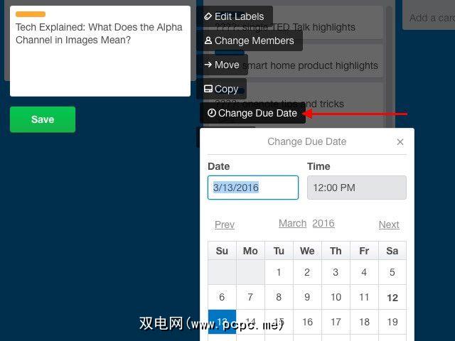 为每个任务卡分配截止日期很容易。首先将鼠标悬停在卡片上,然后点击显示的铅笔图标。这会打开卡的选项菜单。单击其中的更改到期日期以通过弹出的日历设置日期和时间。