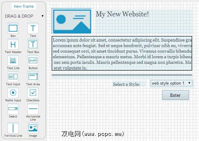 Frame Box是一个非常简单的拖放工具,用于模拟网站。它是免费的,易于使用的,而且如果您在网站上注册,则可以保存线框并与他人共享。如果您正在与朋友或客户进行协作,这确实会有所帮助。