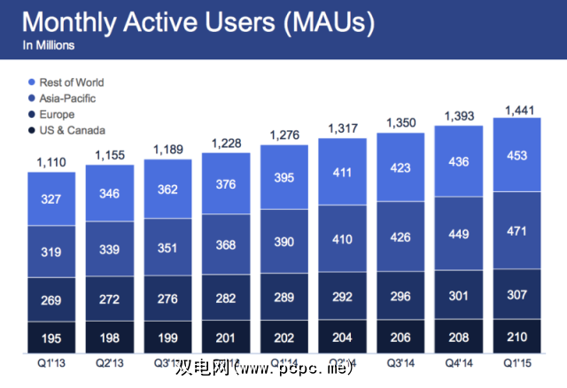 再往前走,Facebook自己说,他们现在有10.4亿日常活跃用户和15.9亿每月活跃用户用户(截至2015年12月,是正确的),其中90%以上的用户来自移动设备。