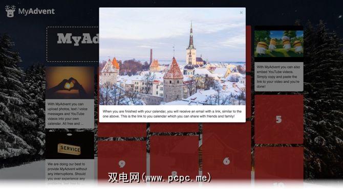 要使用MyAdvent创建个人的在线倒数日历,只需上传照片,添加书面消息和视频链接,自定义样式并与您的朋友。