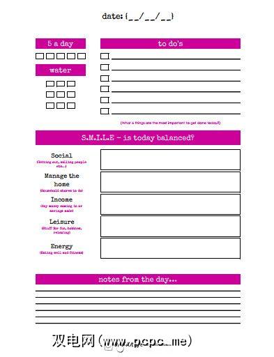 她的每日生产率图表是任何日记的有用插入。它有助于快速浏览当天的情况,而不会陷入细节中。您可能希望使用SMILE(社交/管理房屋/收入/休闲和能源)框跟踪生活中的五个关键区域的想法。