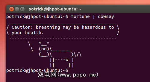 很棒,对吧?并且在安装时,安装 cowsay 。该程序使您可以从命令行让母牛说出您想要的任何内容。 “ 财富"同样没有用,它为您提供了随机报价。为了获得最佳结果,请结合使用两个命令( fortune | cowsay )。