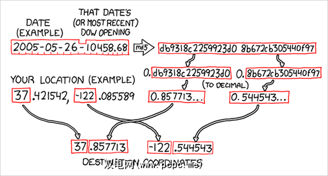 Geohashing是一个受Geocaching启发的活动,每天为您提供随机坐标。随机化使用您当前的GPS位置(因此,目的地永远不会离得太远),并使用来自股市的数据对其进行修改(因此,目的地总是会变化)。