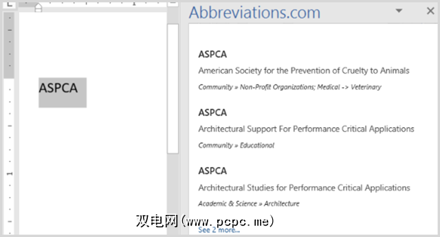 在阅读包含令人困惑的缩写的文档时,Abbreviations.com加载项可以为您提供帮助。只需打开插件,在文档文本中选择缩写,插件窗口就会显示定义。