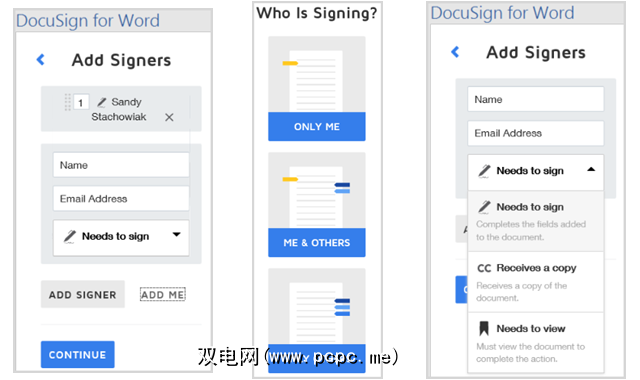 例如,如果仅是签名,则会弹出一个窗口,供您继续操作或在输入错误时关闭。如果其他人正在签名,则可以选择添加其他人以及您自己。只需输入所需签名的名称和电子邮件地址即可。您还可以让收件人只收到一份副本或查看文档。