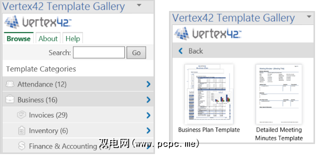 打开加载项窗口时,您会看到一些个人和专业情况下可以选择的类别。然后只需选择一个并查看模板选项。确定所需模板后,单击下载按钮,Vertext42网站将在新窗口中打开,供您获取模板。