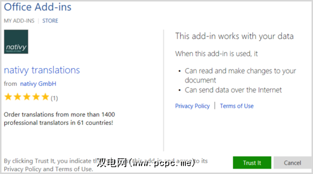 使用任一途径找到加载项时,只需单击即可有关其他详细信息。如果要从Word的弹出窗口访问商店,则将单击信任它按钮进行安装;如果您在网站上,则将单击添加按钮。