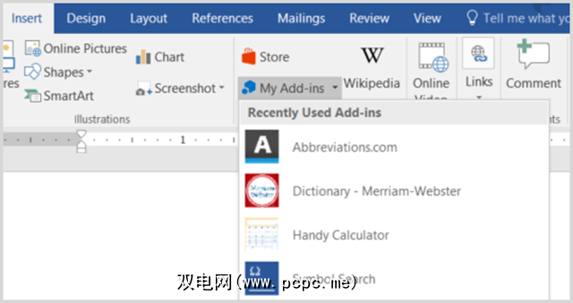 要使用已安装的加载项,只需从插入菜单中单击我的加载项按钮。这将打开一个显示您的选项的窗口,然后双击一个加载项将其打开。您还可以选择按钮旁边的箭头,以查看您最近使用的加载项并从那里选择一个。