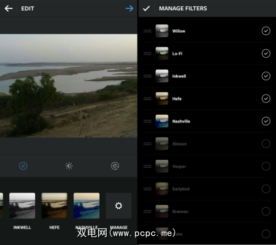 当您在Instagram应用中看到过滤器列表时,请向右滚动到绝对末端,您会发现一个齿轮显示“管理"的图标。点击该按钮可显示所有Instagram过滤器的列表。