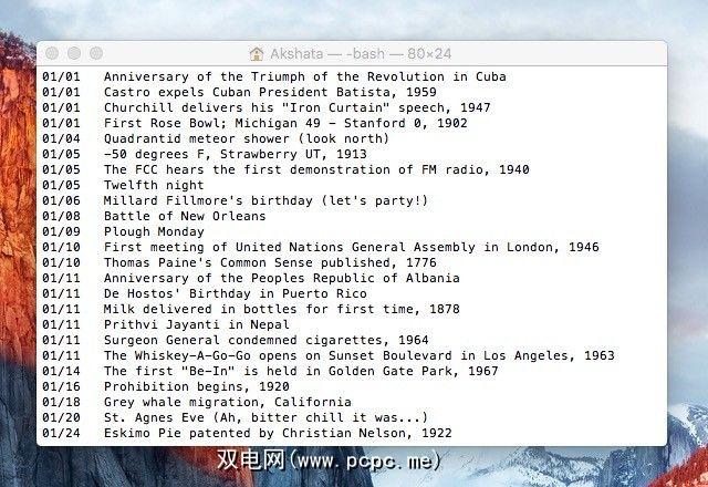 打开终端并在 cat /usr/share/calendar/calendar.history 中键入此内容。按下 Enter 后,您会看到一长串与一年中的每一天相对应的历史事件。有教育意义!